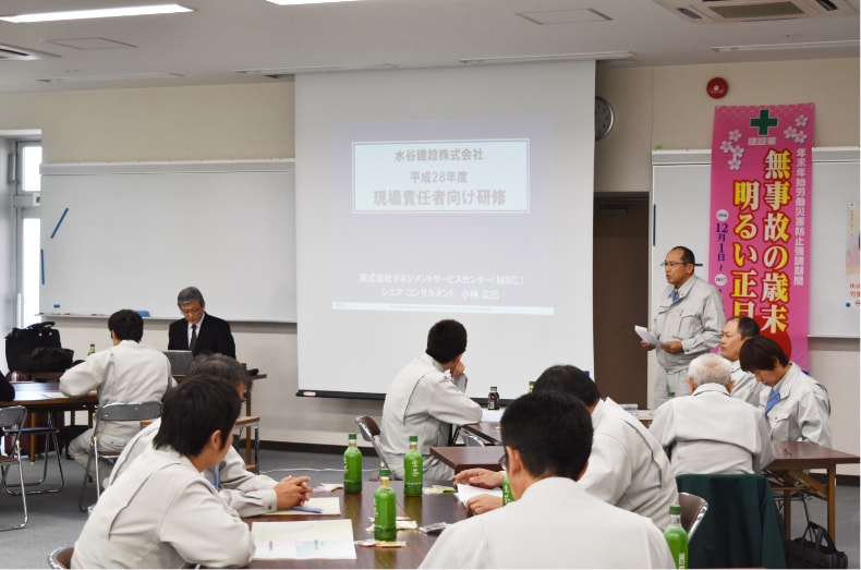 一人ひとりの社員が確実にステップアップできる環境づくりこそ社員教育の基本です。とくに新入社員に対しては、先輩・上司などからの親切・丁寧な指導によって、個人の能力開発を促す一方、各種資格取得のための充実したバックアップ体制も完備。また中堅・ベテラン社員などへの階層別研修や、それぞれの業務分野に適合した専門教育や講習も意欲的に実施。もちろん、かけがえのない安全面における教育も体系的に整備されており、社員の実力アップが水谷建設の成長と発展の原動力となっています。